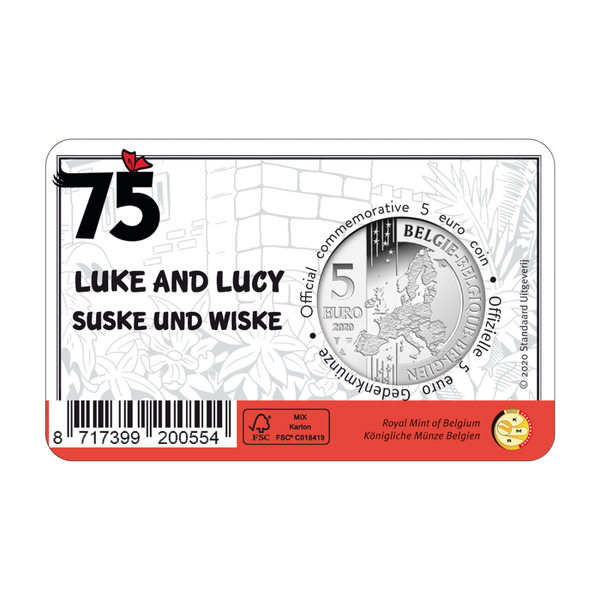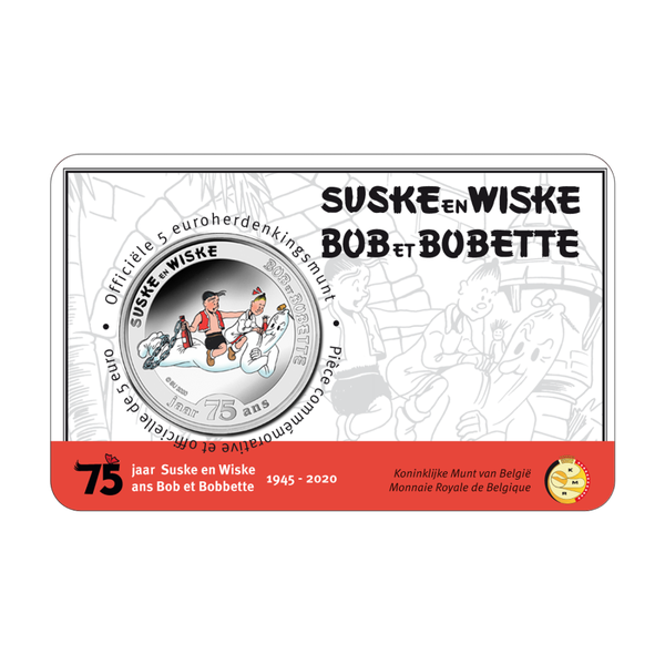 COMBINATIE van beide 5 euromunten België 2020 ’75 jaar Suske en Wiske’ kleur én relief BU in coincard