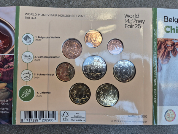 Ook deze World Money Fair set is een set in de themareeks over Belgische specialiteiten. Dit jaar is het thema Chicoree (witlof)! De set heeft de Belgie 8 munten van 2025 in één set.